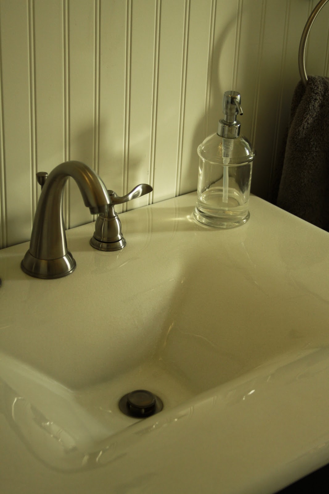 Hi All--Thought I'd post some pics of our hall bath- a light, bright, and happy room...such an improvement over where we started, we really love the combination of historic hex tiles on the floor, our victrola cabinet for the vanity, and our FREE enameled cast iron sink! Enjoy!
